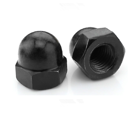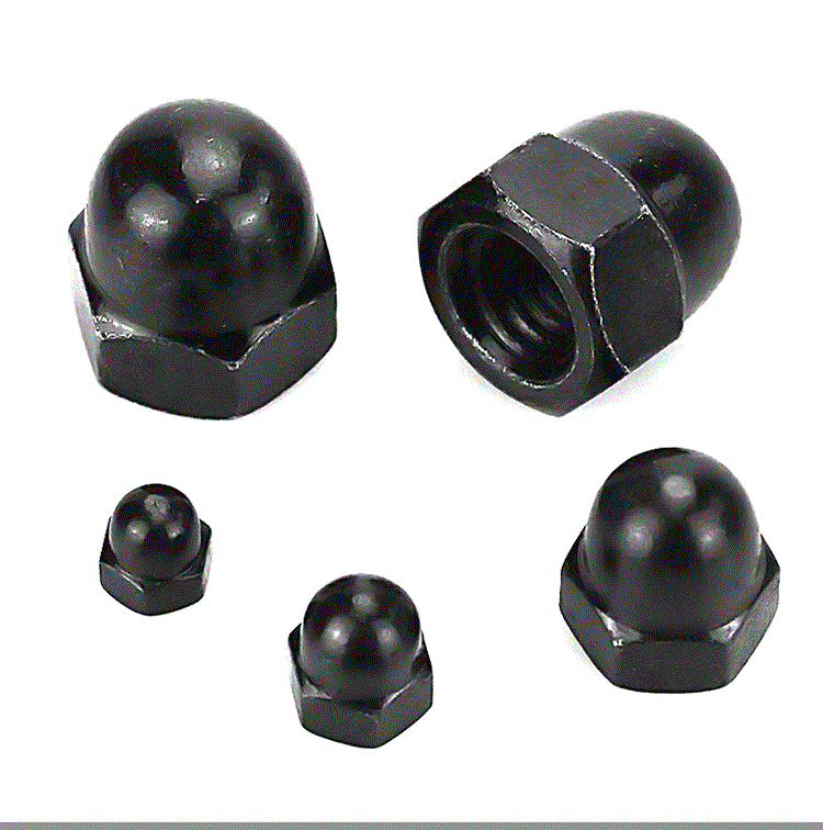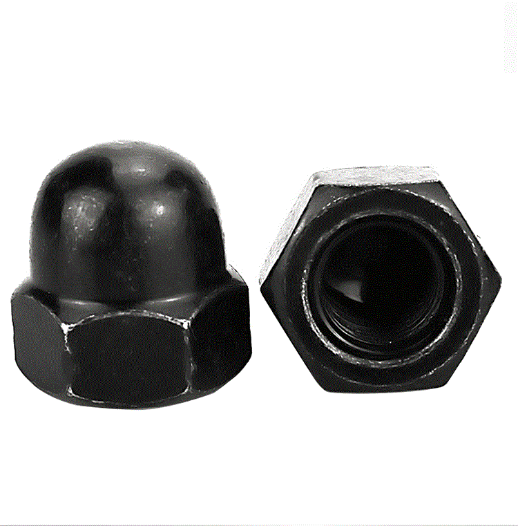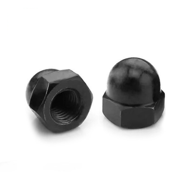 Melni cinkoti oksīda DIN1587 sešstūra uzgriežņi ar kupolveida vāciņu ir sešstūra uzgriežņi ar puslodes formas kupolu, kas aizsargā atsegtas skrūvju vītnes. Izgatavoti no oglekļa tērauda (izturības pakāpes, piemēram, 4,8, 8,8), melnais cinka oksīda pārklājums ir izturīgs pret koroziju un nodilumu. Kupolveida dizainam ir divas lomas: vītņu galu slēpšana, lai nodrošinātu glītu izskatu, un mitruma/putekļu bloķēšana, lai novērstu rūsu. Saskaņā ar DIN1587 standartu tie ir pieejami metriskos izmēros (M4–M36) un tiek izmantoti mēbelēs (piemēram, krēslu kājās), automobiļu apdarē (piemēram, riteņu pārsegos) un mašīnās ar redzamiem stiprinājumiem (piemēram, iekārtu paneļos) gan drošības, gan estētikas nolūkos.